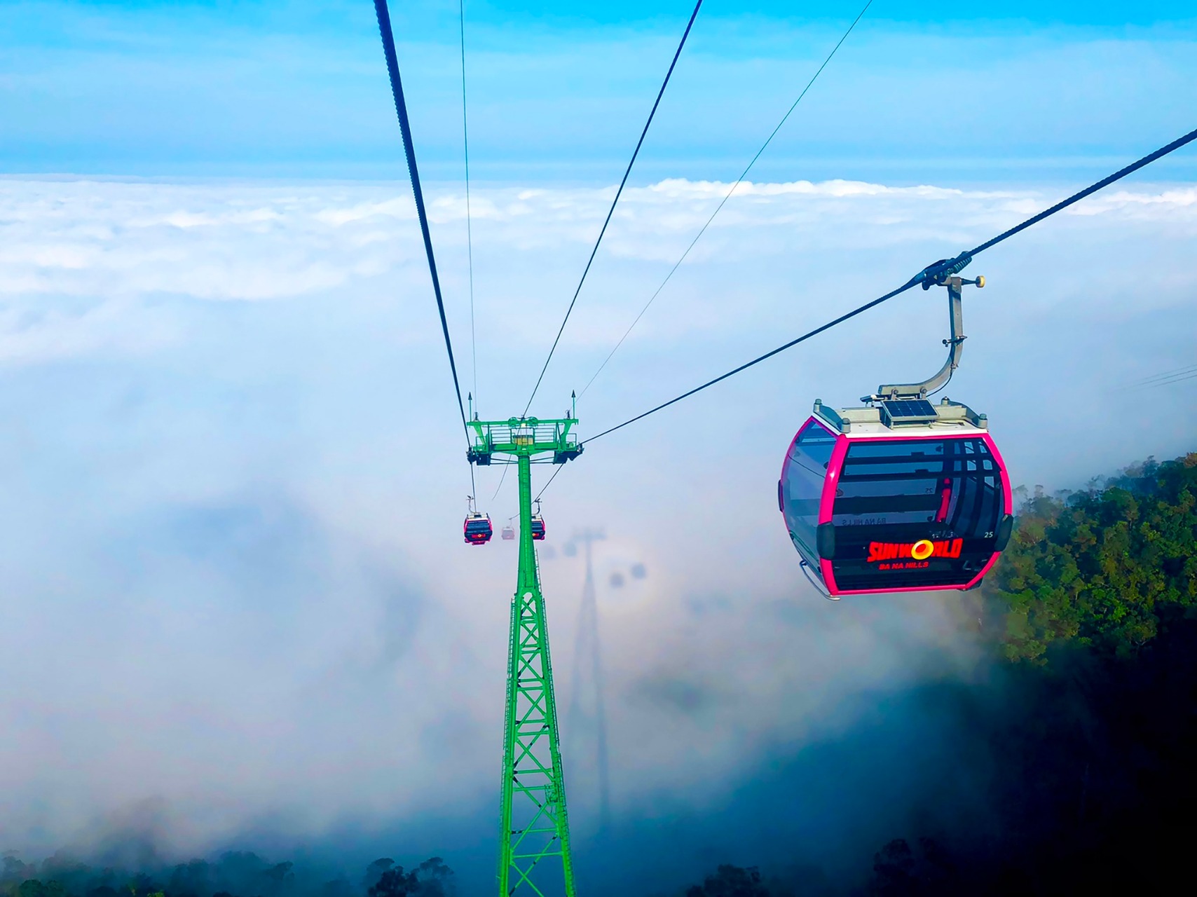 Sau khi HDV hỗ trợ làm thủ tục, bạn bắt đầu hành trình cáp treo lơ lửng giữa núi rừng. Cảm giác nhìn Đà Nẵng thu nhỏ dưới chân, mây trôi ngang tầm mắt – đó là khoảnh khắc đáng giá nhất của chuyến đi.